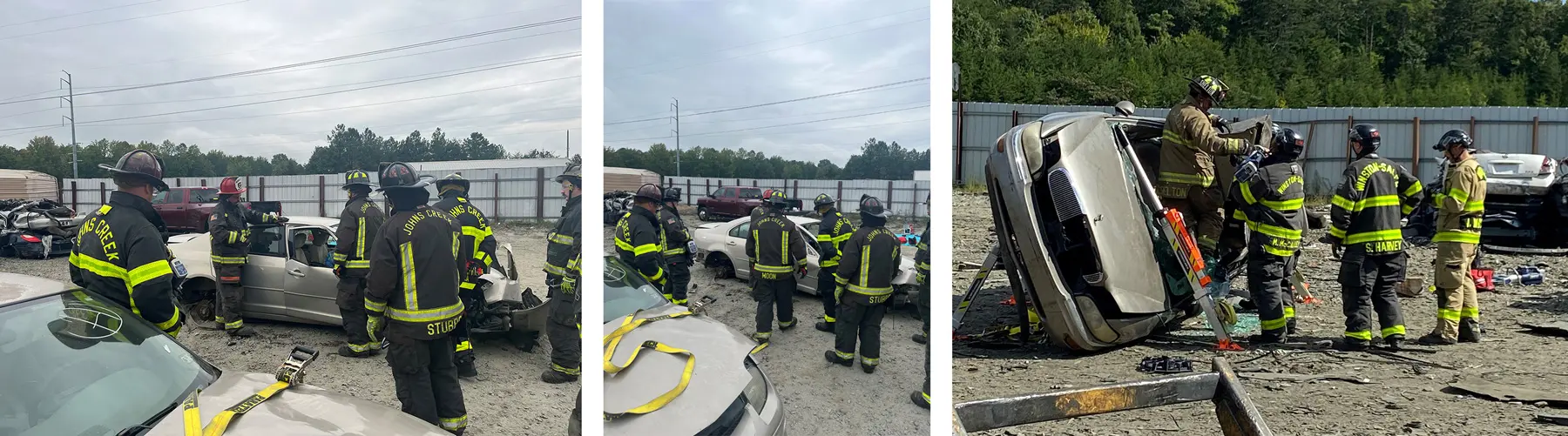 Pull-A-Part offers a valuable resource for Fire Departments: a wide selection of wrecked cars. In mid-September, we were thrilled to welcome firefighters to our locations in Winston Salem, North Carolina and Norcross, Georgia, for training on vehicle extrication techniques. This practice involves using specialized tools such as the 'jaws of life' to cut through metal and Paratech stabilization struts to safely reach injured passengers in accidents. These essential tools require hands-on practice, and we’re proud to provide a space for these dedicated teams to hone their skills.